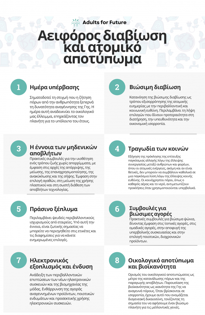 Λέξεις-κλειδιά: βιώσιμη διαβίωση, οικολογικό αποτύπωμα, δικαιοσύνη μεταξύ των γενεών
