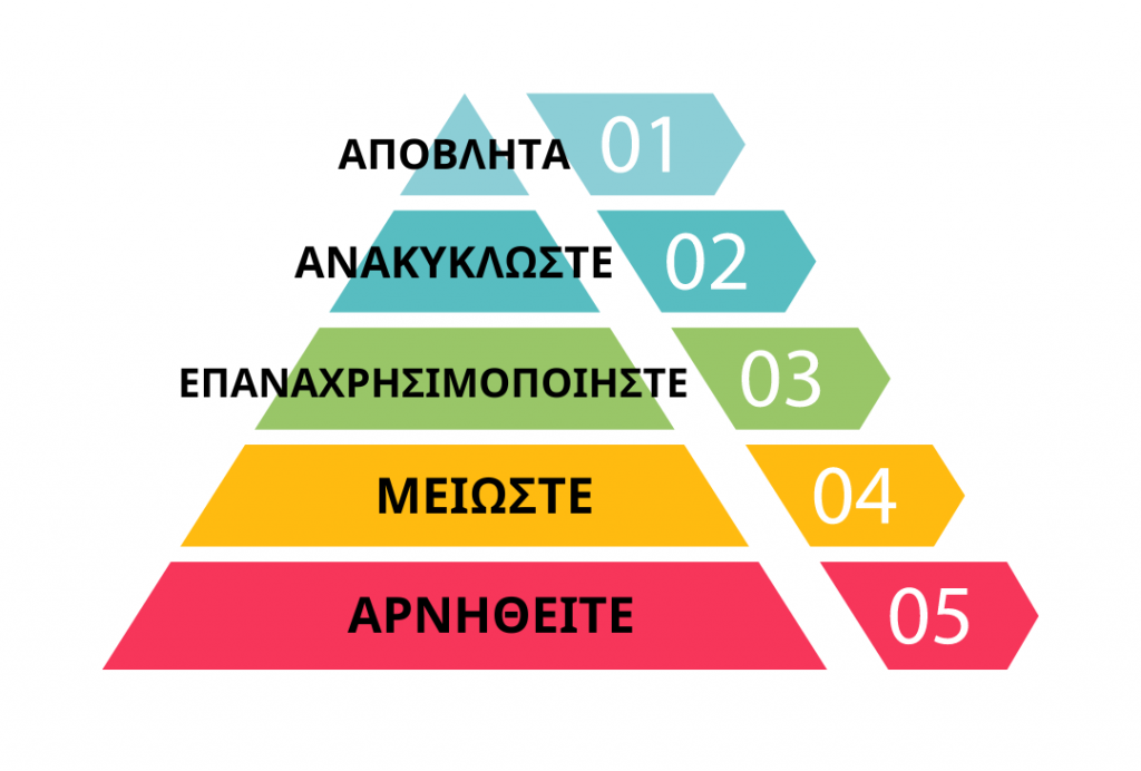 ΜΕΙΩΣΤΕ: Μειώστε την κατανάλωση συσκευασμένων και πλαστικών προϊόντων. Αντικαταστήστε τα πλαστικά αντικείμενα με εκείνα σε χαρτί ή, ακόμα καλύτερα, με προϊόντα χωρίς συσκευασία. Προτιμήστε υψηλής ποιότητας, ανθεκτικά αντικείμενα που διαρκούν περισσότερο, ελαχιστοποιώντας την ανάγκη για συχνές αντικαταστάσεις. Να προσέχετε τα τεχνολογικά απόβλητα, τα οποία είναι πολύ κρίσιμα όταν πρόκειται για την εξοικονόμηση στρατηγικών πόρων και σπάνιων στοιχείων (ελέγξτε την Ενότητα 1!), καθώς τα τεχνολογικά απόβλητα ανακυκλώνονται μόνο κατά 40% στην Ευρώπη! Φροντίστε να επικοινωνήσετε με τις υπηρεσίες ανακύκλωσης του τοπικού σας δήμου για να καταλάβετε πώς να απορρίπτετε σωστά τα τεχνολογικά απόβλητα.
