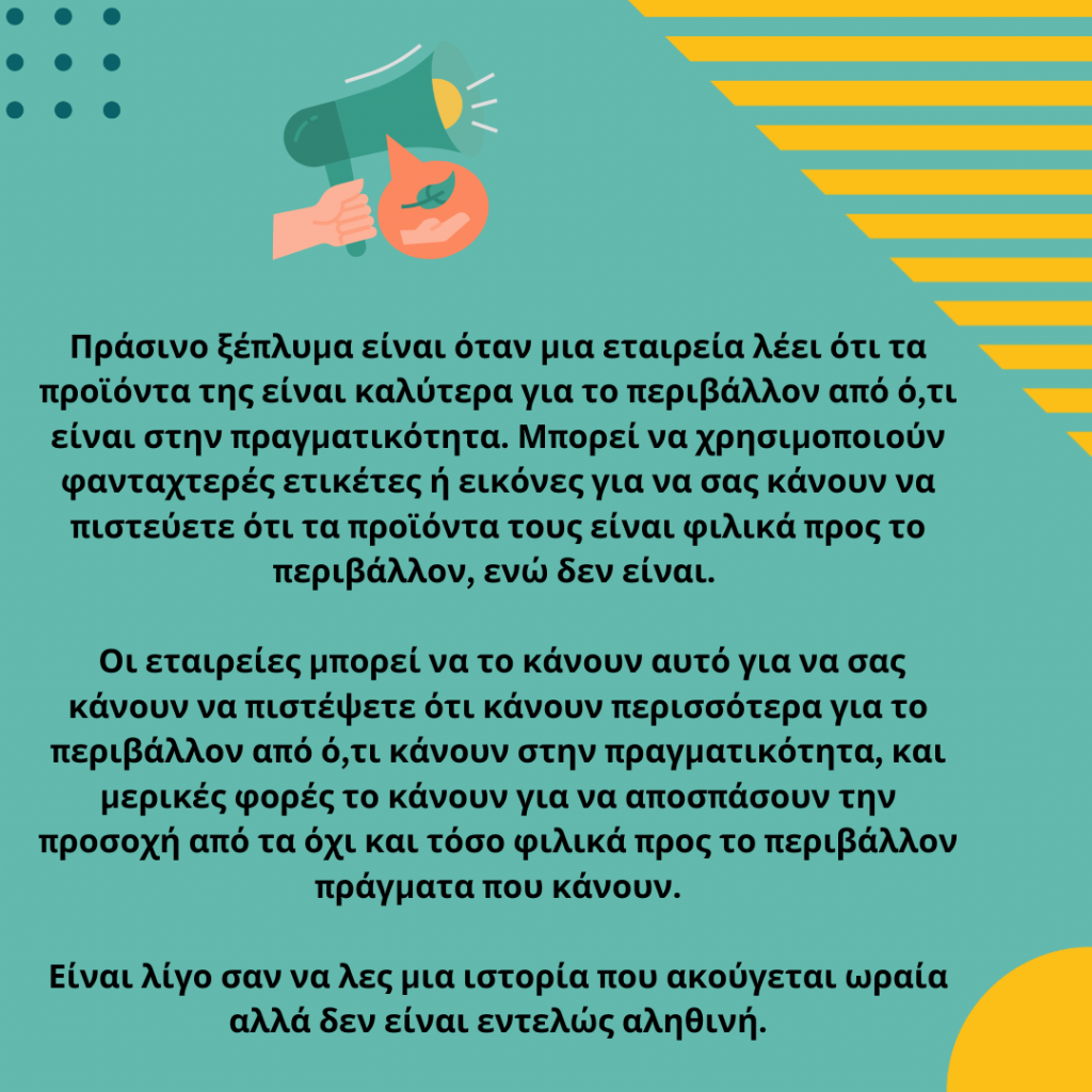 Αυτό που μόλις περιγράψαμε ονομάζεται “πράσινο ξέπλυμα”. Το “πράσινο ξέπλυμα” συμβαίνει όταν μια εταιρεία προβάλλει έναν περιβαλλοντικό ισχυρισμό για κάτι που κάνει ο οργανισμός, ο οποίος αποσκοπεί στην προώθηση μιας αίσθησης περιβαλλοντικού αντίκτυπου που δεν υπάρχει. Ο πράσινος ισχυρισμός αφορά συνήθως κάποια μορφή θετικής επίδρασης στο περιβάλλον.
