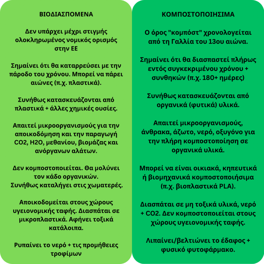 Μια άλλη σημαντική πτυχή που πρέπει να συζητηθεί αφορά τα κομποστοποιήσιμα και τα βιοδιασπώμενα προϊόντα, τα οποία φαίνονται παρόμοια ή ακόμη και συνώνυμα, αλλά στην πραγματικότητα είναι πολύ διαφορετικά. Όταν πρόκειται για την κατανόηση των διαφορών μεταξύ βιοδιασπώμενων και κομποστοποιήσιμων συσκευασιών, είναι σημαντικό να γνωρίζετε ότι τα βιοδιασπώμενα προϊόντα διασπώνται σε φυσικές ουσίες με την πάροδο του χρόνου, ενώ τα κομποστοποιήσιμα προϊόντα μετατρέπονται σε πλούσιο σε θρεπτικά συστατικά λίπασμα σε συγκεκριμένες συνθήκες κομποστοποίησης.