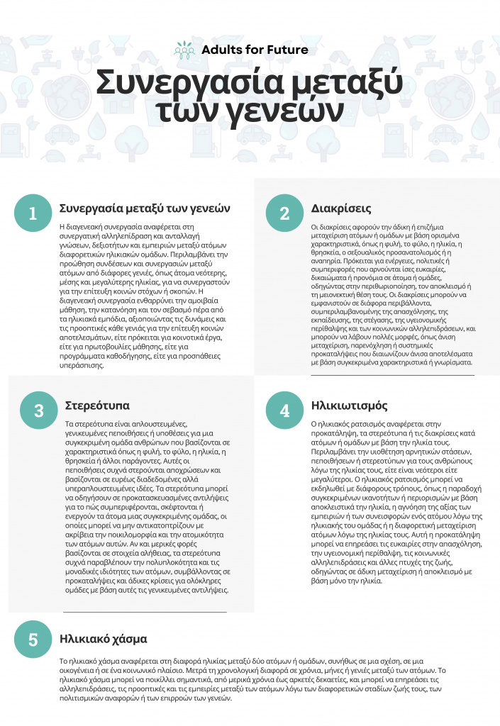 Σύντομη περιγραφή της ενότητας: Θα μάθετε πώς να προσδιορίζετε και να περιγράφετε την έννοια της συνεργασίας μεταξύ των γενεών για την περιβαλλοντική αλλαγή, να προσδιορίζετε τα οφέλη της συνεργασίας μεταξύ των γενεών στην κοινότητα, να αυξάνετε την κατανόηση σχετικά με τις διακρίσεις λόγω ηλικίας και τις πρακτικές ένταξης στον περιβαλλοντικό ακτιβισμό.