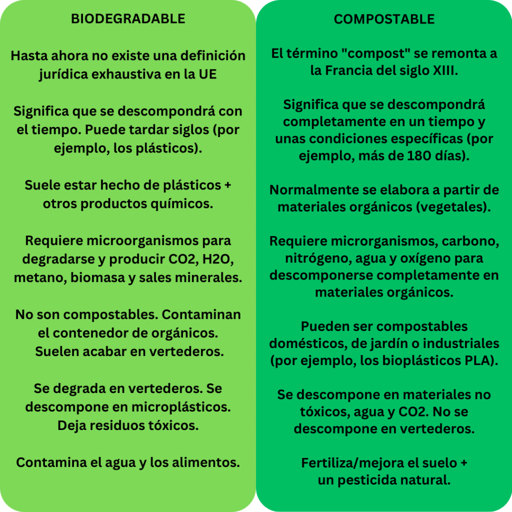 Otro aspecto importante a tratar se refiere a los productos compostables y biodegradables, que parecen similares o incluso sinónimos, pero en realidad son muy diferentes. A la hora de entender las diferencias entre envases biodegradables y compostables, es esencial saber que los artículos biodegradables se descomponen en sustancias naturales con el tiempo, mientras que los compostables se convierten en compost rico en nutrientes en condiciones específicas de compostaje.