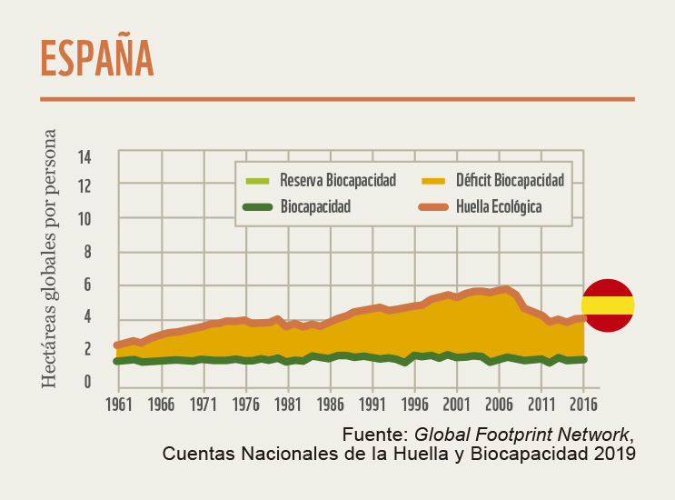 Desde el otro lado, un concepto espejo es la biocapacidad. La biocapacidad se refiere a la capacidad de la Tierra para regenerar recursos renovables y absorber residuos, proporcionando apoyo a las actividades humanas al tiempo que mantiene los ecosistemas. Representa la capacidad de los sistemas naturales para producir recursos como alimentos, madera y energía renovable, así como para absorber y procesar residuos, incluidas las emisiones de dióxido de carbono.