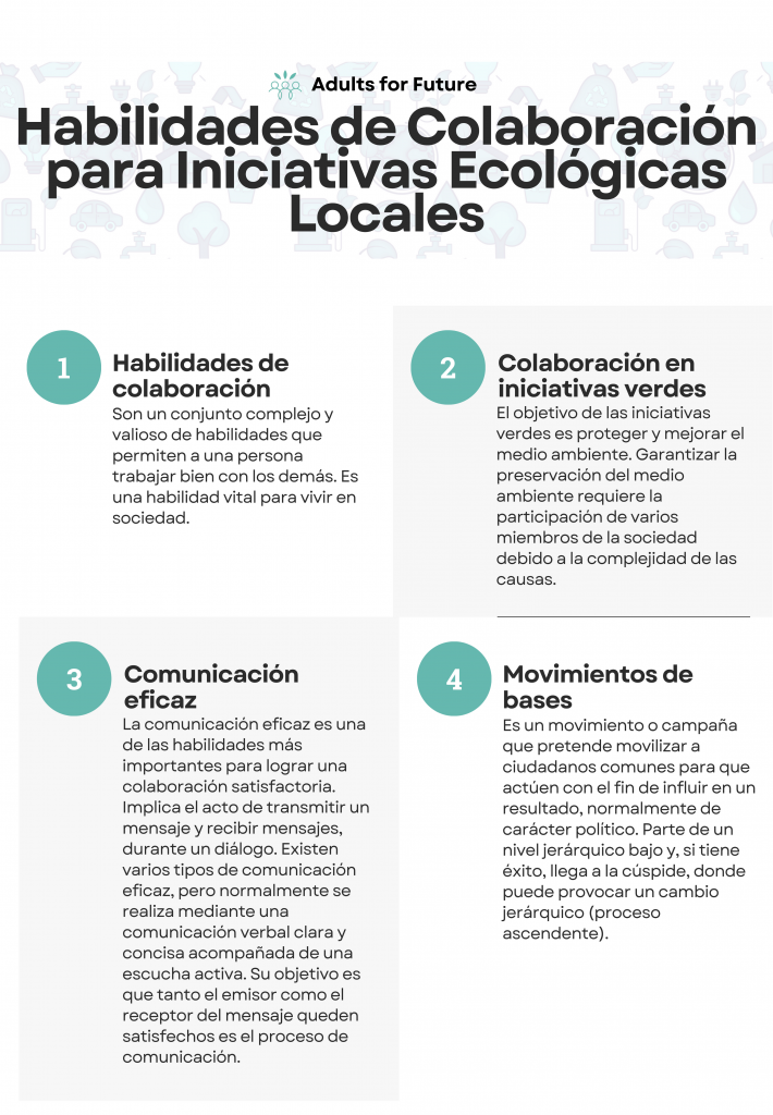 Palabras clave: Habilidades de colaboración, Comunicación efectiva, Cooperación, Trabajo en equipo, Iniciativas verdes, Movimiento de bases.