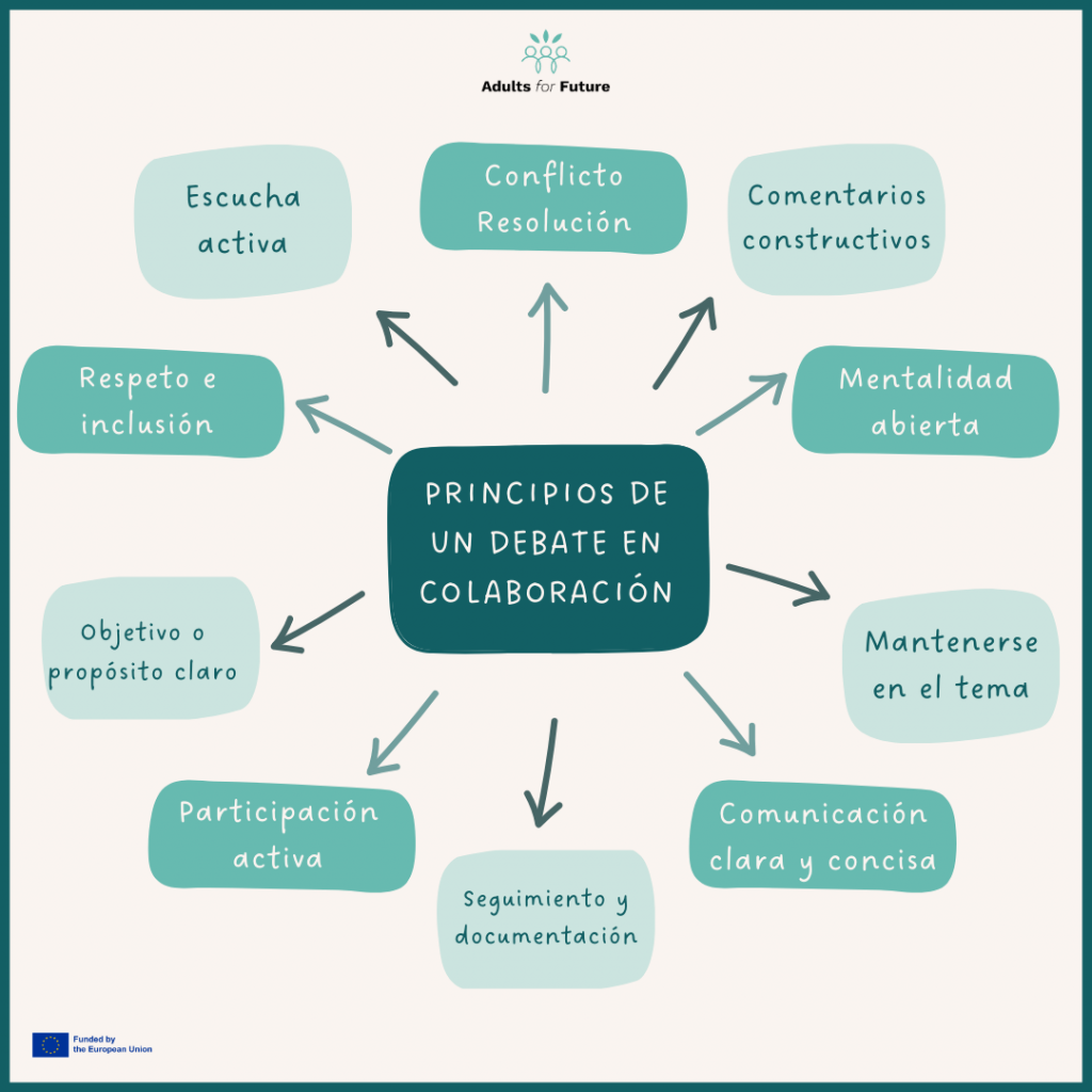 Los debates en colaboración, independientemente del marco en el que se celebren, se rigen por varios principios clave que ayudan a garantizar una comunicación eficaz, la resolución de problemas y la cooperación entre los participantes. Estos principios promueven un intercambio productivo y respetuoso de ideas e información. He aquí los principios fundamentales de los debates en colaboración (fig. 1):