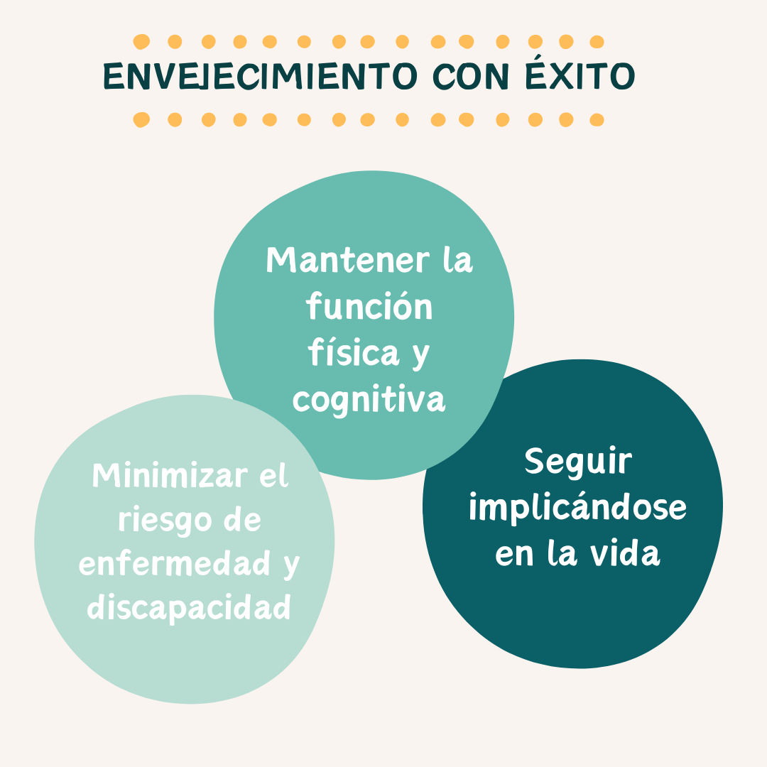 Figura 2 – Envejecer con éxito se compone de tres elementos: el mantenimiento de la función física y cognitiva, minimizar los riesgos de desarrollar enfermedades o discapacidades y, por último, ser capaz de seguir comprometido con la vida. Inspirado en Fatemeh Estebsari et al. (2020).