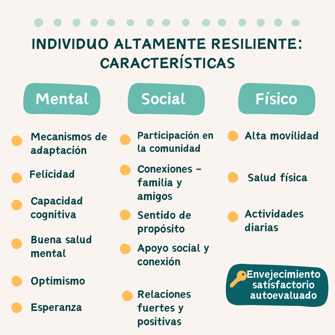 La resiliencia es un pilar fundamental para envejecer con éxito, ya que designa la capacidad de recuperarse de un acontecimiento estresante o de una adversidad en la vida (Reshma Aziz Merchant et al., 2022). La alta resiliencia se ha relacionado con la longevidad y la calidad de vida en general. Los estudios demuestran que los individuos altamente resilientes tienen menor mortalidad, depresión y riesgos de salud mental, enfermedades cardiacas, resistencia al estrés y movilidad. También parecen tener una visión más positiva, esperanzada y agradecida de la vida, así como una mejor autopercepción de envejecer con éxito (MacLeod et al., 2016). La resiliencia es multidimensional e incluye componentes mentales, sociales y físicos (MacLeod et al., 2016), las características de estos componentes se ilustran en la fig. 3.