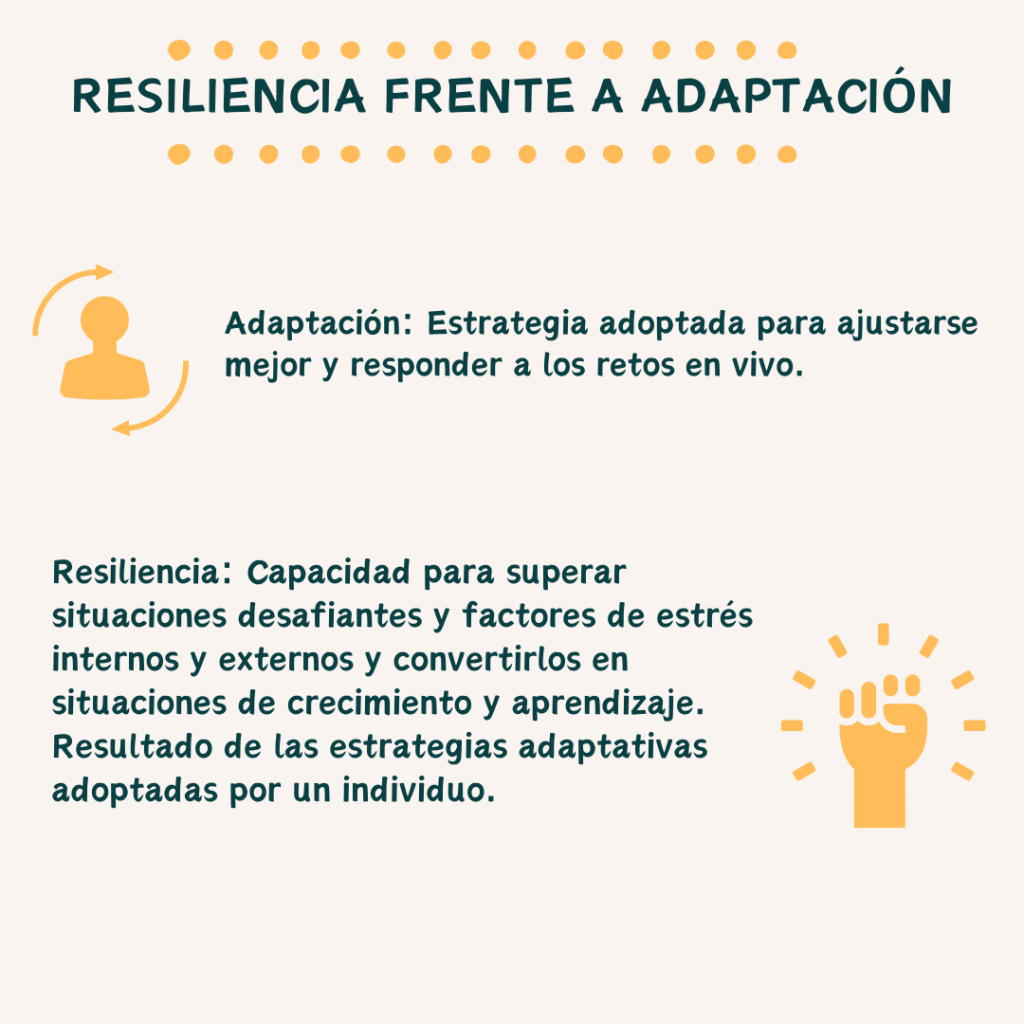 En suma, la adaptación es la acción emprendida y la resiliencia es el resultado de la adaptación (fig. 1). A menudo, estos términos se utilizan como sinónimos.