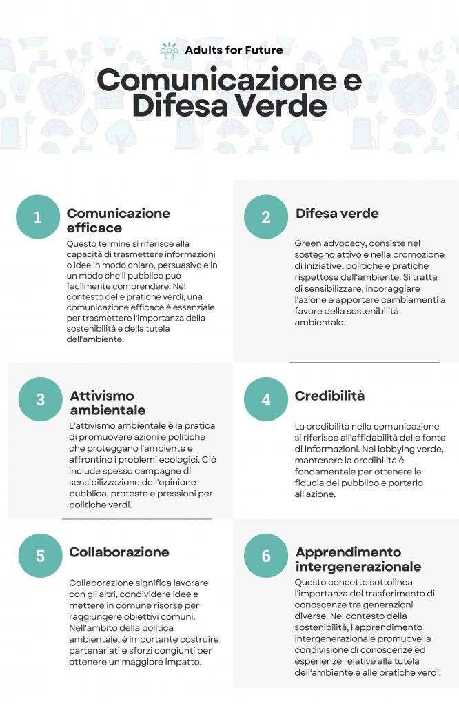 Parole chiave: Comunicazione; Advocacy verde; Sostenibilità; Comunicazione efficace; Attivismo ambientale; Credibilità; Collaborazione; Apprendimento intergenerazionale.