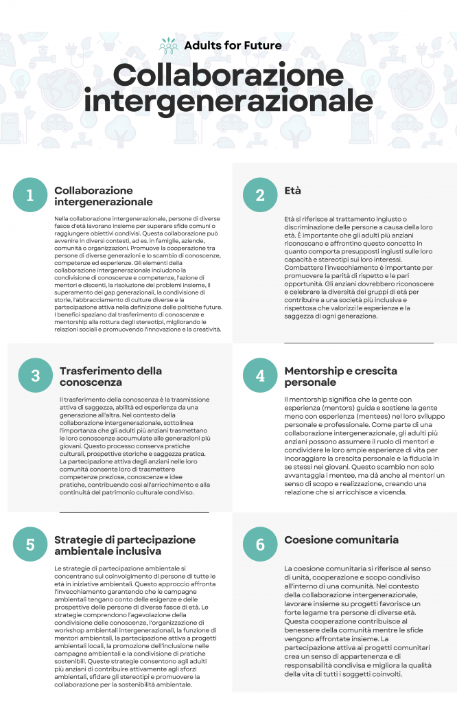 La collaborazione intergenerazionale si riferisce agli sforzi collaborativi e agli scambi tra individui di età o generazioni diverse, in modo da favorire le stesse condizioni di vita per il presente e il futuro.