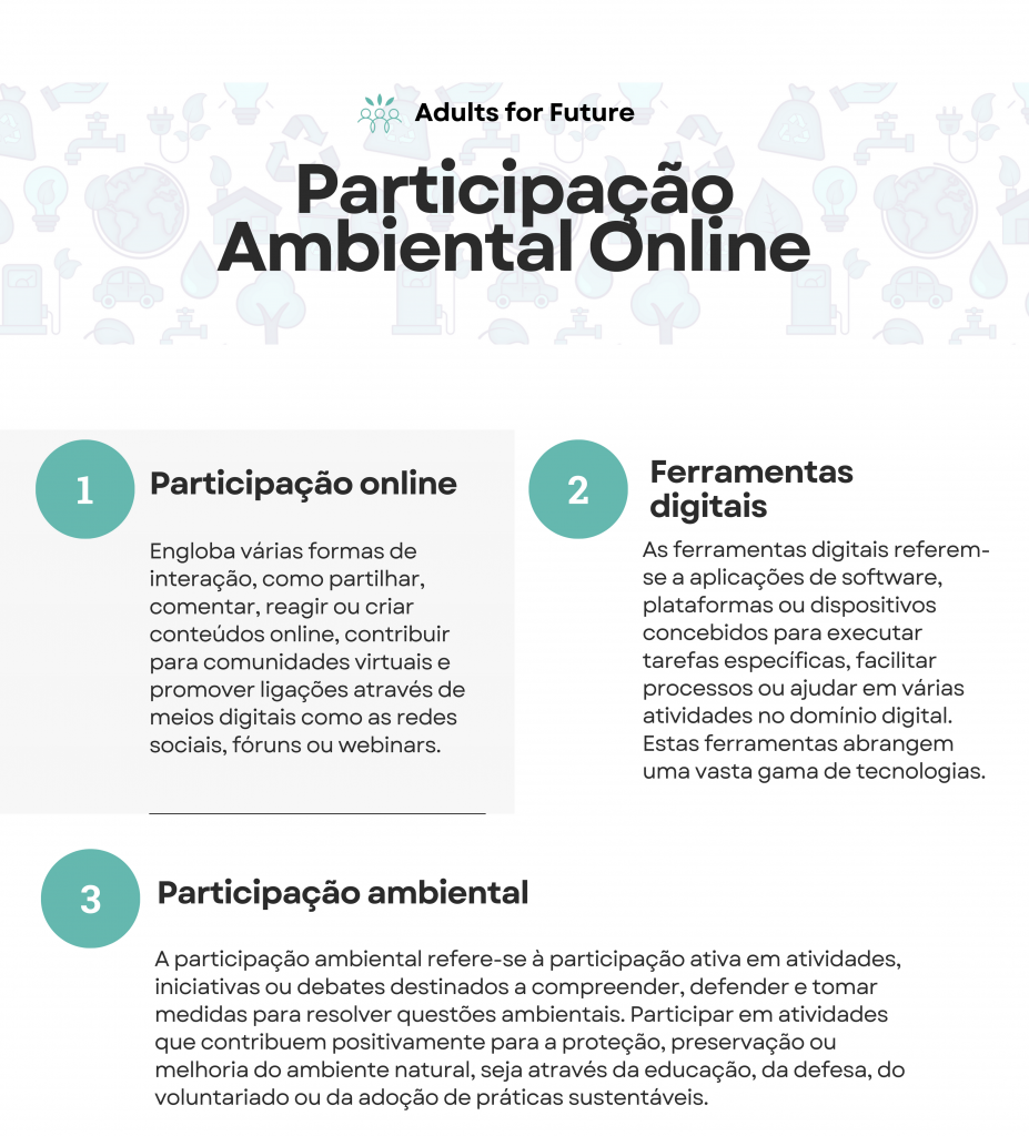 A participação ambiental online refere-se à participação ativa de indivíduos, organizações ou grupos em atividades e debates relacionados com questões ambientais em plataformas digitais e através de canais online.