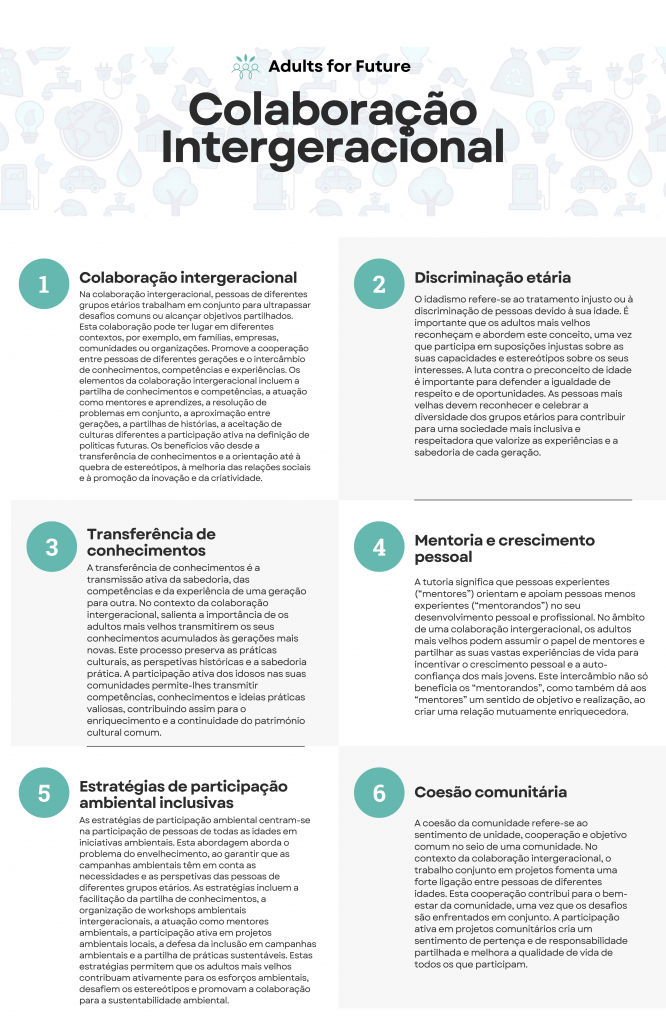 - Refletir sobre o ambiente. Participar em atividades de reflexão relacionadas com a cooperação ambiental. Partilhe as suas ideias sobre a importância da colaboração intergeracional para enfrentar os desafios ambientais, salientando o valor das diferentes perspetivas.